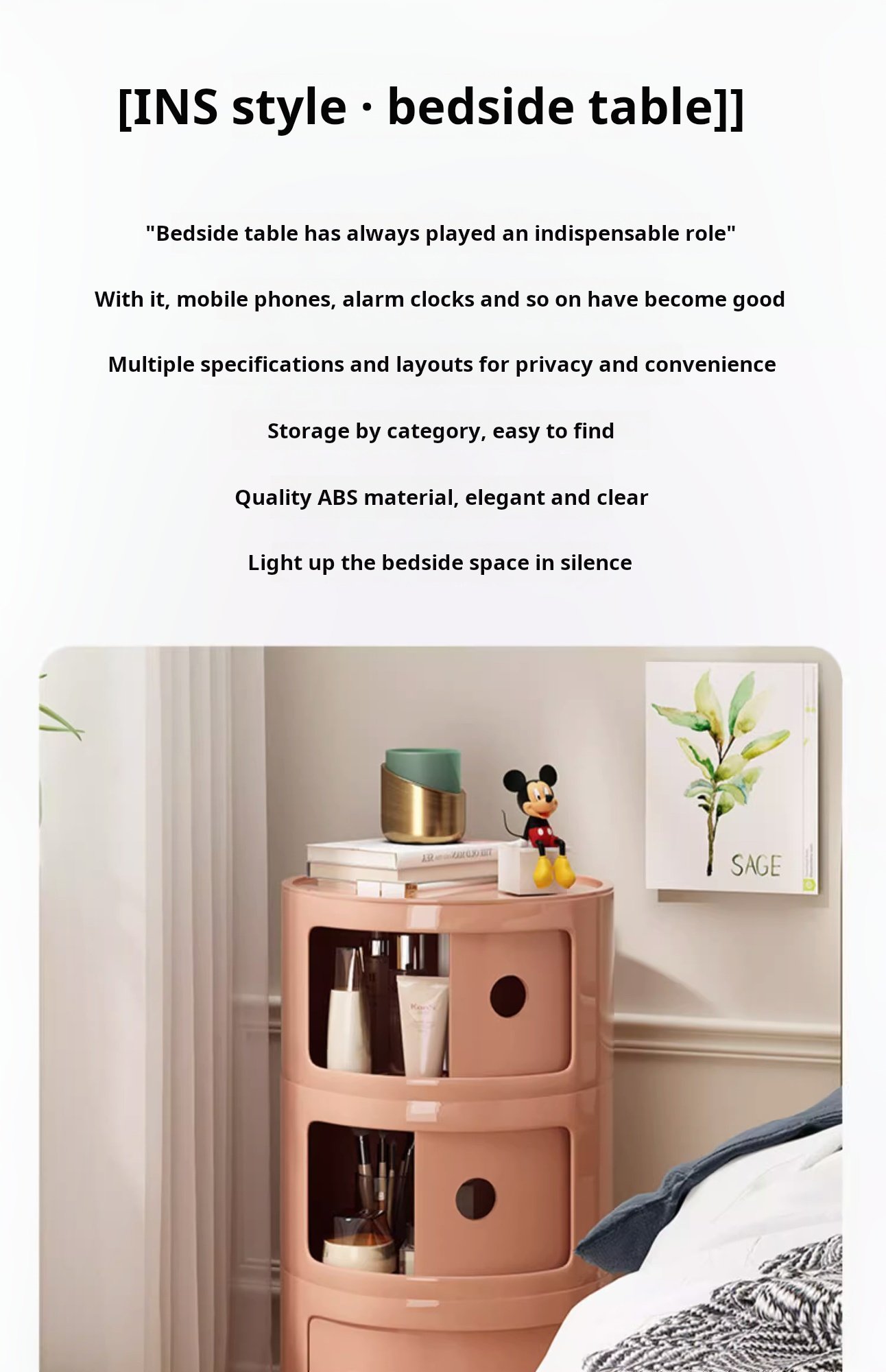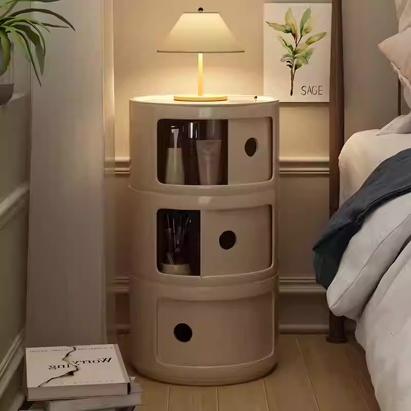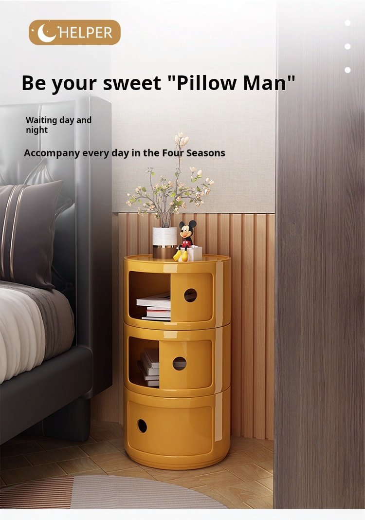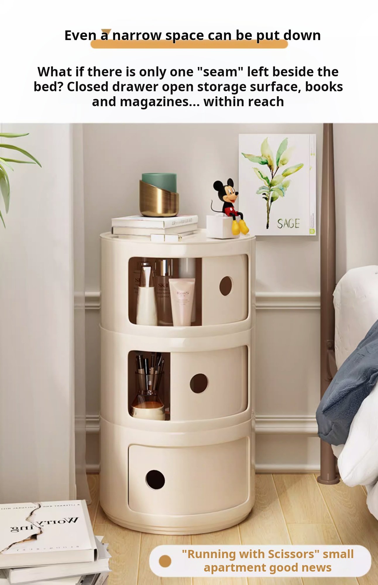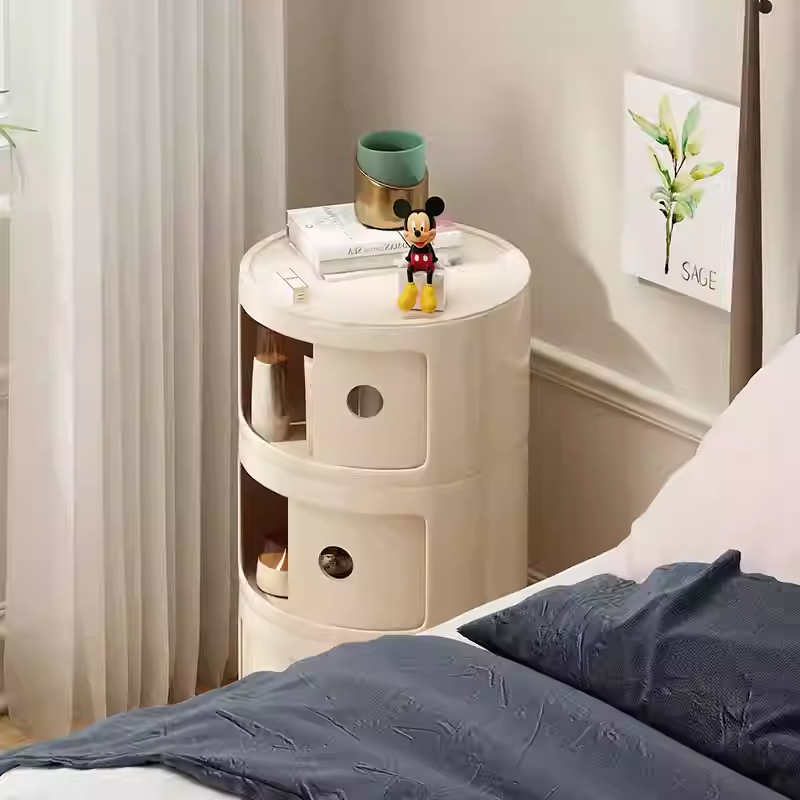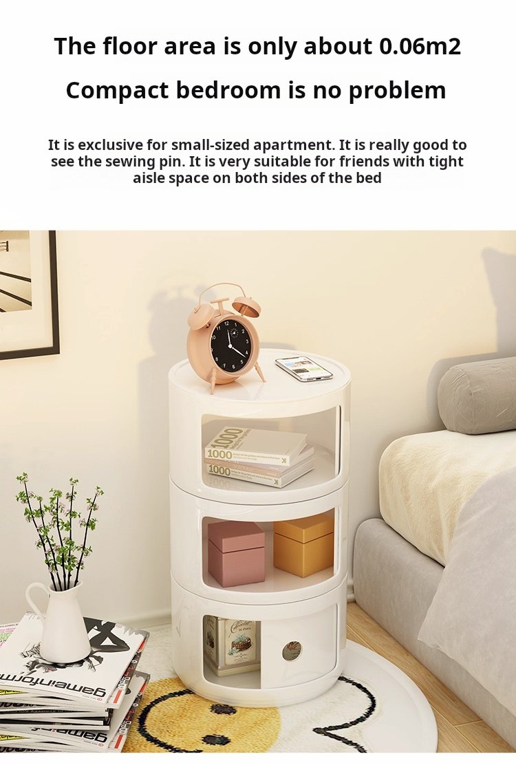 Cream-colored bedside cabinet with narrow edges, round storage shelf, creative macaron-style small bedroom storage cabinet