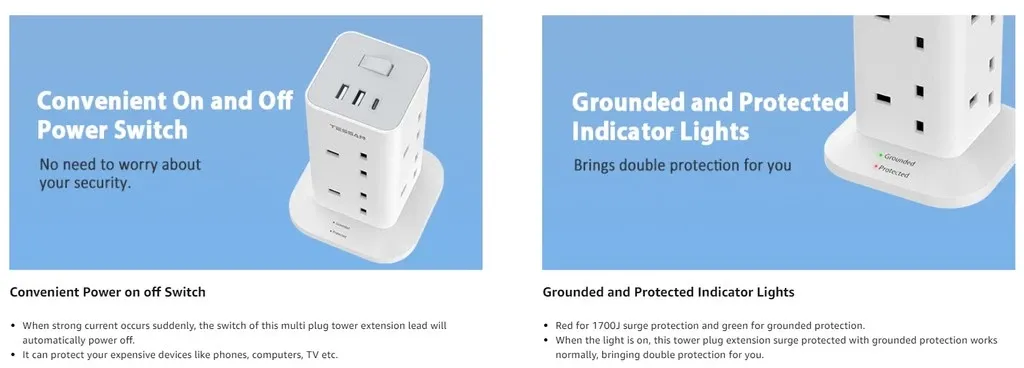 Be the first to review “Tower Extension Plug with USB Type C Multi Plug Extension Socket Safety Mark Surge Protector” Cancel reply