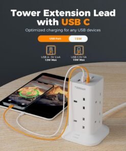 Tower Extension Plug with USB Type C Multi Plug Extension Socket Safety Mark Surge Protector